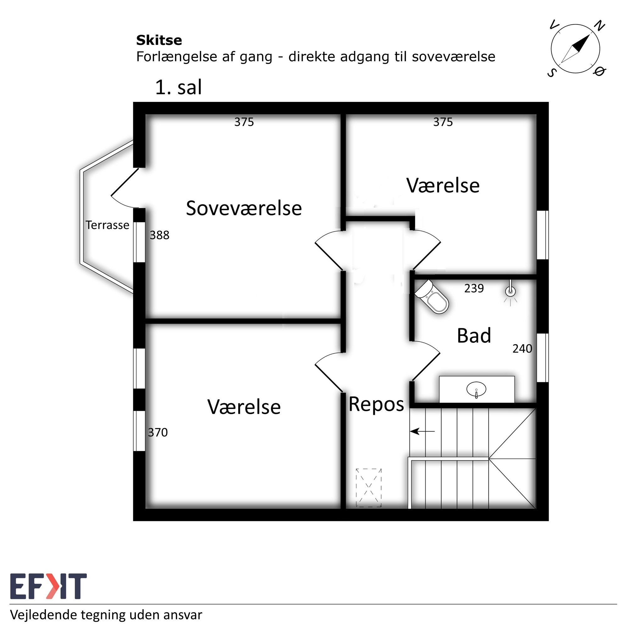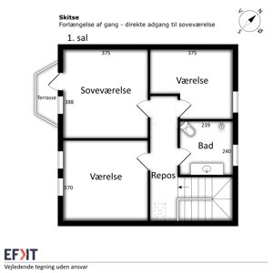 På førstesalen findes et repos, to rummelige børneværelser, et lyst badeværelse med bruseniche samt et stort soveværelse med ny dør og direkte udgang til altanen.